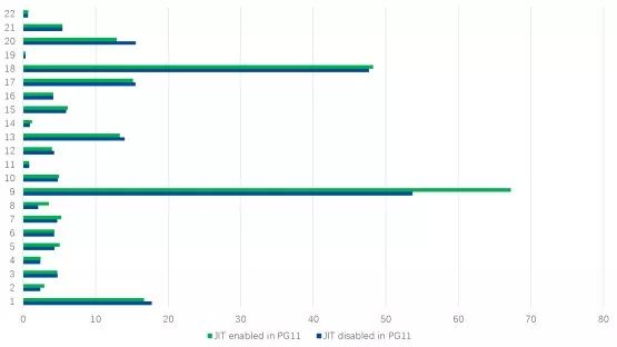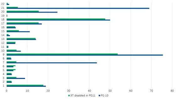 我们可以得到这样的结果(单位为秒,PG11和PG10中禁用JIT):
