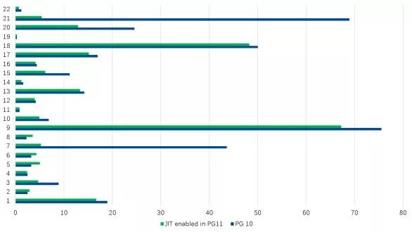 我们可以得到这样的结果(单位为秒,PG11和PG10中启用了JIT):