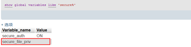 2、secure_file_priv的值为空值,该值可通过执行mysql语句show globalvariables like 'secure%';查看