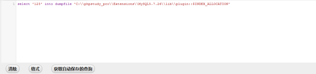 select '123' into dumpfile'C:\\phpstudy_pro\\Extensions\\MySQL5.7.262\\lib\\plugin::$INDEX_ALLOCATION'