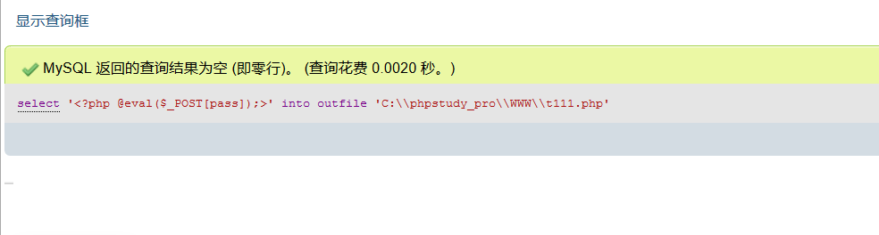 1、目标服务器存在php应用,且已知应用的物理绝对路径为C:\phpstudy_pro\WWW,现可执行select php木马内容 into outfile‘C:\\phpstudy_pro\\WWW\\t111.php’