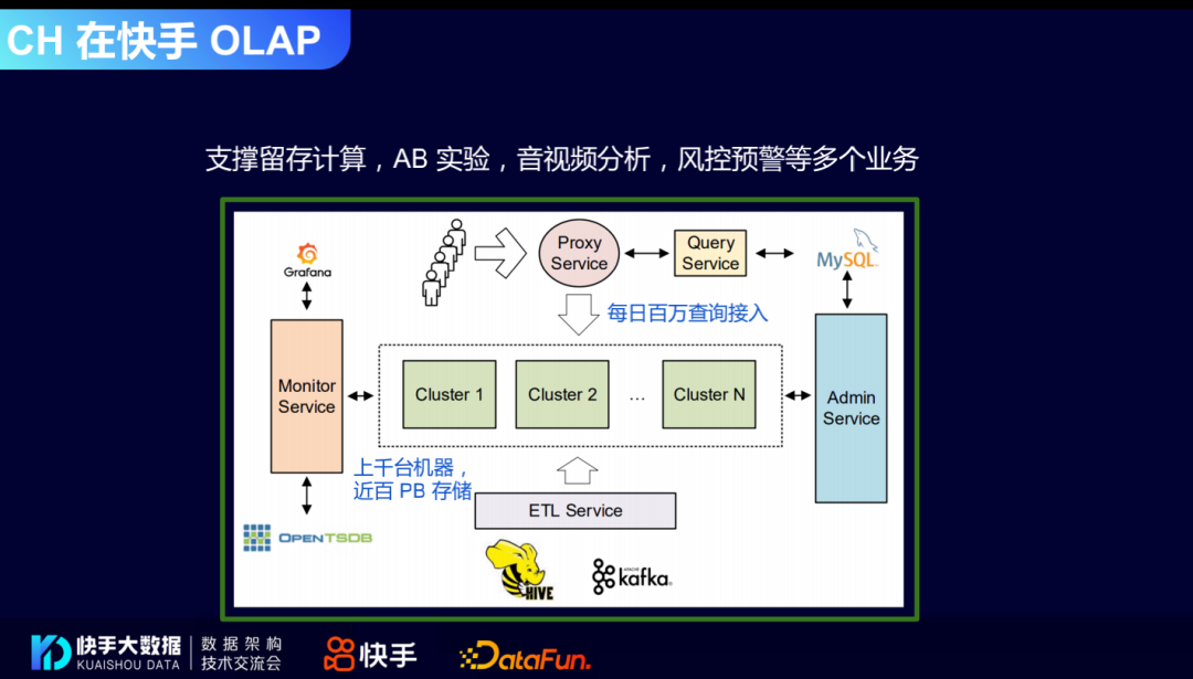 提供的服务包括:支撑留存计算、AB实验、音视频分析、风控预警等都在ClickHouse上有所应用。整体的规模大概是每天几千万查询接入,累计百PB存储数据量,上千台ClickHouse节点。