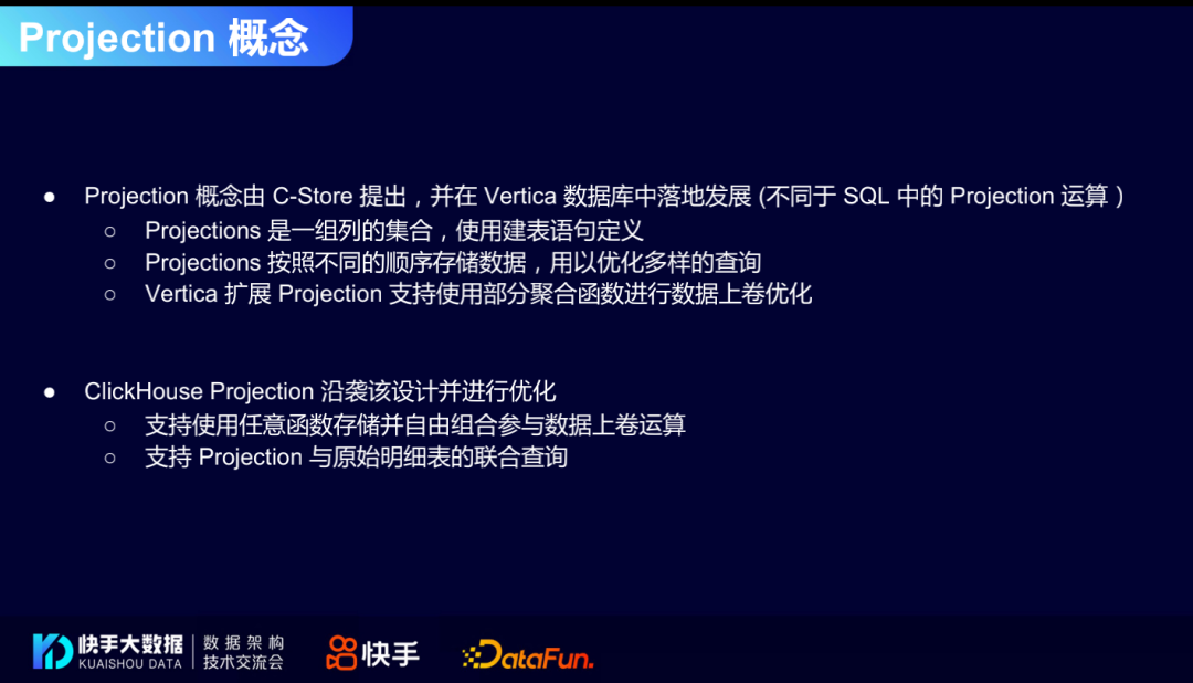 Projection是一组列的集合,用建表语句可以定义,这个概念在C-Store提出后,他们成立了一个公司叫Vertica,做列存数据库,Projection在Vertica数据库中落地发展,不仅仅是按照不同的顺序做存储,同时还支持部分的聚合函数,比如sum、min、max以及一些上卷的优化,可以通过Projection的机制来完成。