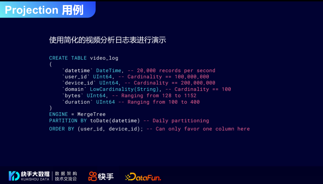 这里我们使用视频分析日志表来进行演示,这个表每秒大概2万条记录数,存在两列,user_id和device_id,基数大概两亿的规模。同时还有一个domain的低基数列,表示域名,然后视频的属性包括bytes、duration两个指标维度。它的排序规则是按照user_id、device_id的顺序来进行排序。
