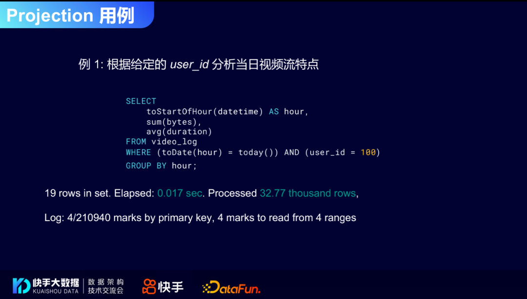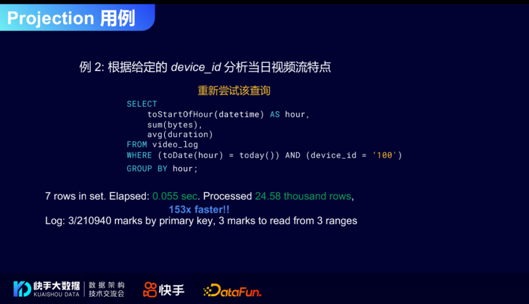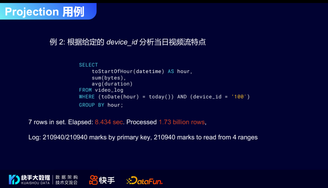 再来看一个Projection的用例,比如按照域名聚合(大概100个基数),来做当日视频流特点分析,这个其实在ClickHouse里面性能已经很不错了,17亿的数据,ClickHouse单机大概11秒就跑结束了,已经可以体现它的高效性,但是仍然不足以去渲染看板。看板是希望能够即席分析,点开就能看到。