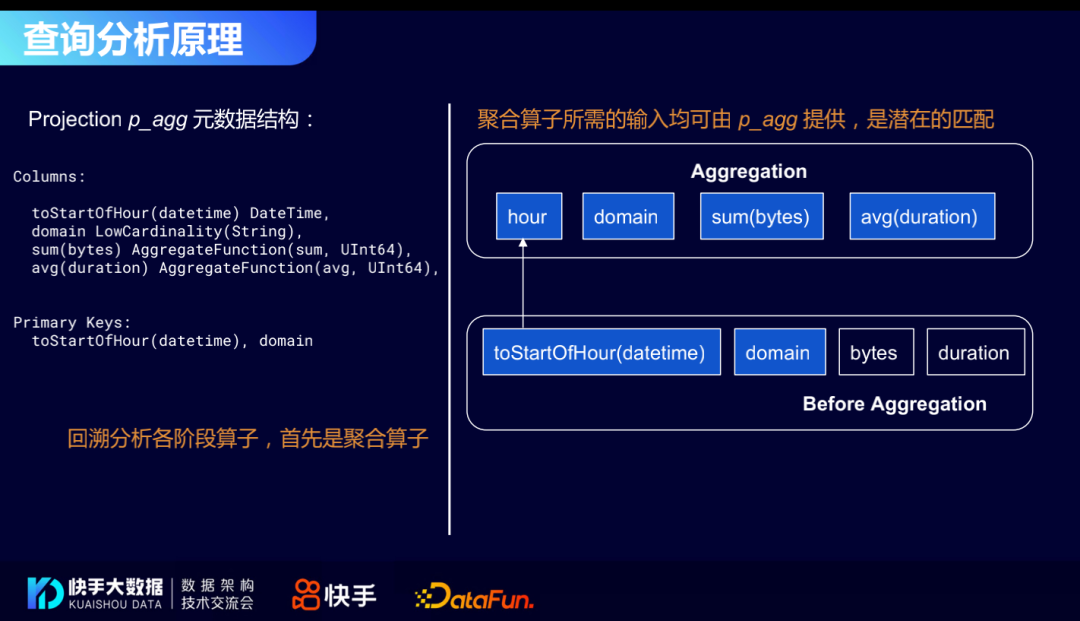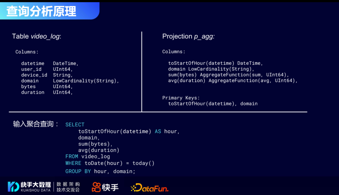 可直接通过待优化的查询进行定义,用户要优化一个查询,可以把查询丢给Projection,做一些中间阶段的预聚合,并且预聚合的过程能够自动泛化匹配其他查询