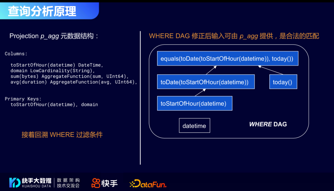Projection查询分析:回溯分析查询计划,使用标准表达式名称进行匹配验证,使得可以命中Projection,得出正确的查询结果,并根据选出来的Projection重建执行计划,完备的实现一致性的查询效果。