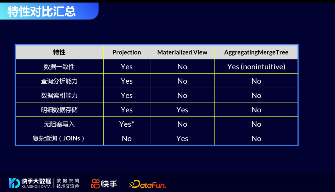 首先看一下目前Projection对ClickHouse本身的物化提升对比图,整体上来看,Projection基本全方面都是优秀的,如:数据一致性、查询分析能力、数据索引能力、明细数据存储、最优秀的一点是可以保证无阻塞写入,也就是实时写入性,能够做一些逻辑上的Projection的优化,也就是在写入过程中不需要Projection,但是在查询的过程中一部分Projection的优化能够命中就能起到优化的效果。这是一个渐进的过程。