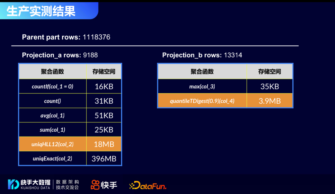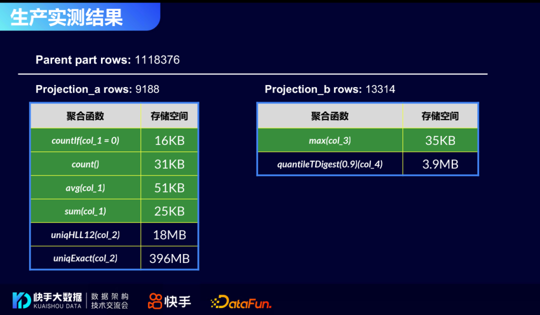 从另外一个角度看,主要就是存储成本。存储成本主要是看聚合指标使用的函数,因为我们现在的Projection支持任意函数,这时候就要考虑哪些指标得规避,简单的指标比如上图中绿色部分的,基本可以随便建,没有什么存储开销,基本都是KB级的。