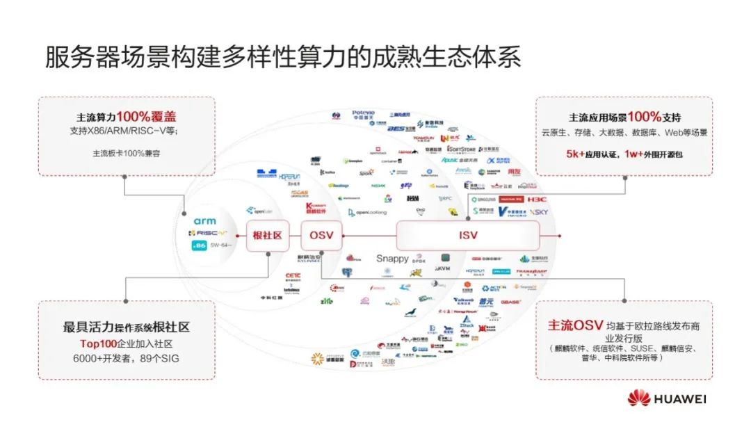 一、服务器场景构建多样性计算的成熟生态体系。主流算力100%覆盖支持X86/ARM/RISC-V等。实现主流板卡100%兼容。二、主流应用场景100%支持云原生、存储、大数据、数据库、Web等场景。实现5k+应用认证,1w+外围开源包。三、最具活力操作系统根社区Top100企业加入社区。6000+开发者,89个SIG。四、主流OSV均基于欧拉路线发布商业发行版。如麒麟软件、统信软件、SUSE、中科创达、麒麟信安、普华、中科院软件所等。在展台上你能看到欧拉使能合作伙伴,在多个领域发挥了自己的强大算力。各行各业,各有所长却都与欧拉实现了深度融合。