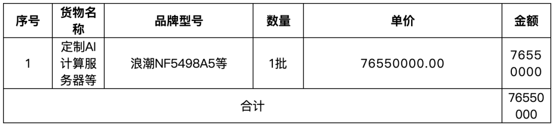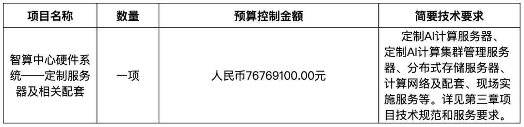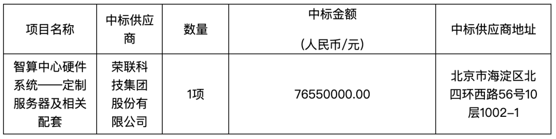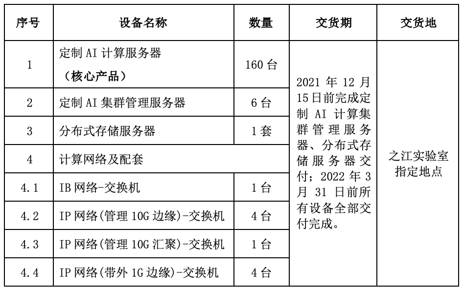 2021年8月31日,之江实验室发布《智算中心硬件系统——定制服务器及相关配套》采购的公开招标公告,预算 76769100.00 元。注:本项目除IB网络-交换机之外,不允许采购进口产品。AI训练加速卡必须为国产。本次购置的定制设备主要用于构建具备 28P 单精度算力、集群规模不少于1000卡的人工智能超级计算机。2021年9月22日中标结果公告发布,荣联科技 7655 万元中标。
