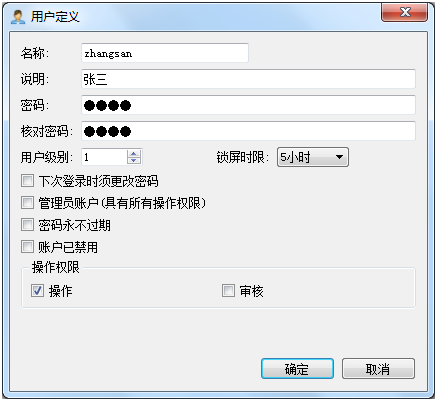 用户:用户有账户名、姓名、级别、超时时间(登录超过一定时间则自动退出)、操作、审核权限、管理员账户、密码永不过期、下次登录需修改密码、账户已禁用等属性。
