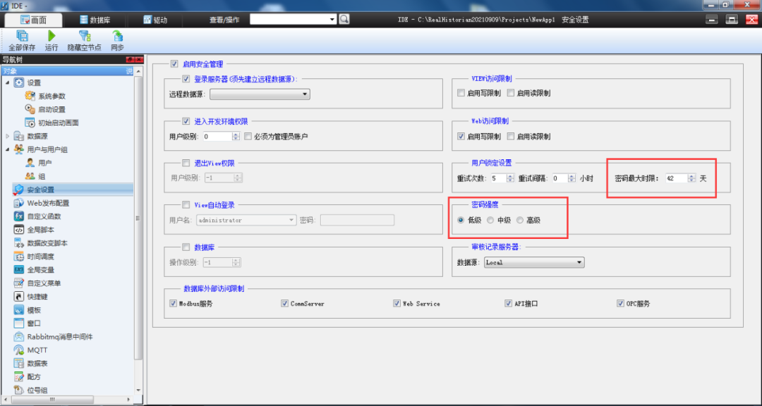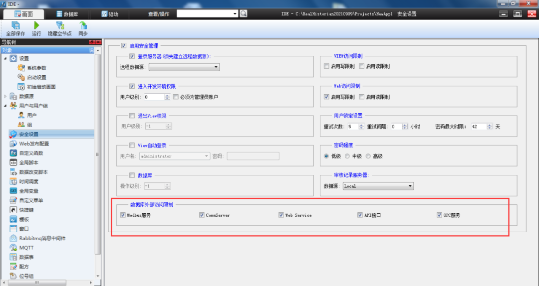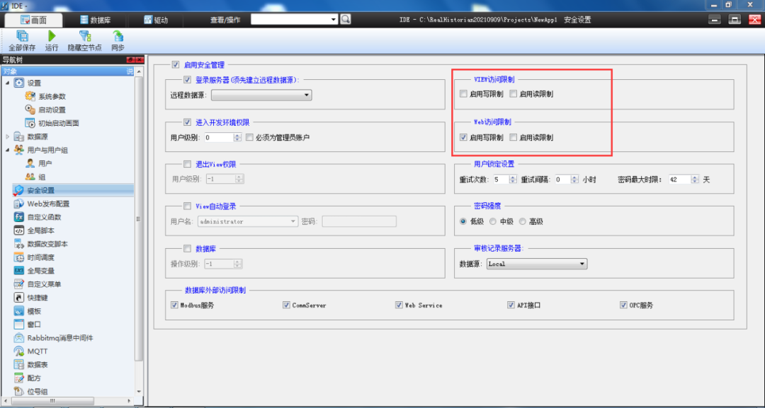 上述安全设置只有在“安全设置配置”中启动了安全管理,且启动了VIEW或Web客户端的读写限制才起作用。外部程序访问的限制则需要只要在“安全设置配置”中勾选相应的限制才起作用。外部程序受点的安全属性限制,与图元、画面、配方等设置项无关。
