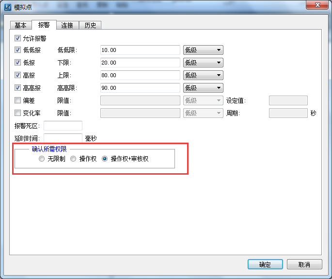 报警确认安全设置:可对报警确认进行限制,只有属于该点可写用户组的用户才可进行确认操作。限制分为:1、无限制。2、操作权。3、操作权+审核权。