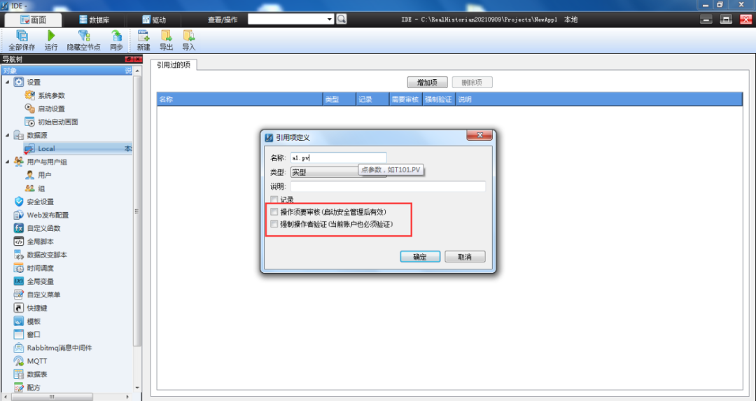 数据库变量位于数据源下,如下图所示。对数据库变量可以指定启用操作审核。指定了审核的变量在操作时需要操作员与审核员双重认证。