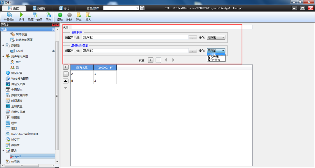 与点的安全区属性类似,配方分为使用配方与维护(增、删、改)配方两方面的保护,使用与维护配方可单独指定安全区,并可在操作权限中指定是否需要审核者确认。配方只有在人为操作时受限,在自动执行脚本中不受限制。