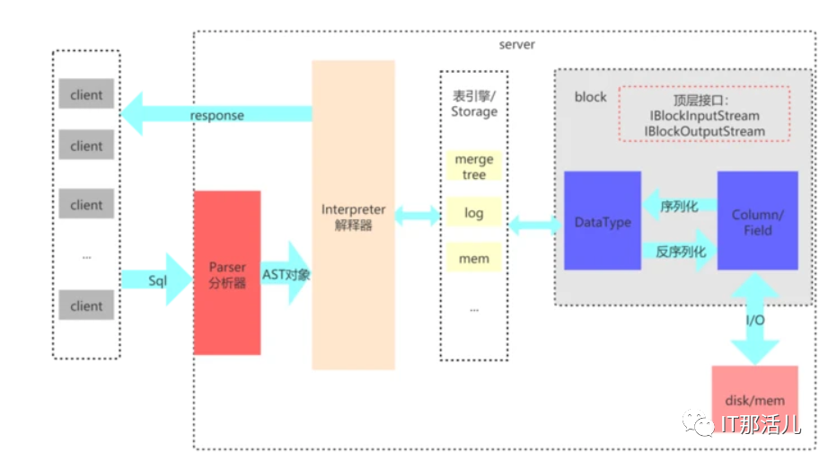 数据的序列化和反序列化工作由DataType负责。根据不同的数据类型,IDataType接口会有不同的实现类。DataType虽然会对数据进行正反序列化,但是它不会直接和内存或者磁盘做交互,而是转交给Column和Filed处理。