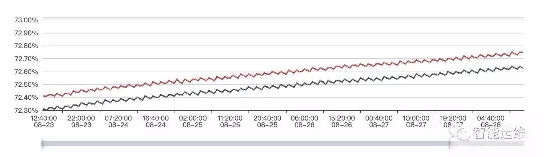 对于很多有趋势规律的场景,可以通过提前预警的方式,降低问题的紧迫程度和严重性。下图是两台机器一周内的磁盘使用率监控图,可以预见,按照目前的增长趋势,必然会在某一个时间点触发磁盘剩余空间 5% 的报警。