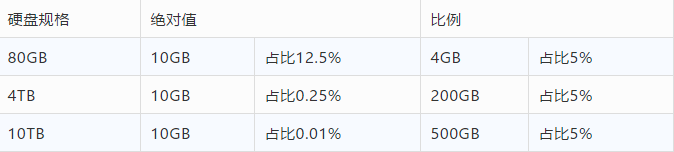 提前预警面向的是有规律的场景,而日常巡检,还可以发现那些没有规律的隐患。以 CPU 使用率为例进行说明,近期的一个业务上线后,CPU 使用率出现偶发突增的情况,但是无法触发报警条件(例如 3 分钟内有 5 次使用率超过 70% 报警),因此无法通过报警感知。放任不管的话,只能是问题足够严重了,才能通过报警发现。这个时候,如果每天有例行的巡检工作,那么这类问题就能够提前发现,尽快解决,从而避免更加严重的问题发生。线上机器的规格不同,如果从绝对值角度进行监控,则无法适配所有的机器规格,势必会产生大量无意义的报警。以磁盘剩余空间监控为例,线上规格从 80GB 到 10TB 存在多种规格,从下图表格看,比例比绝对值模式能更好的适配各种规格的场景(EXT4 文件系统的默认预留空间为 5%,也是基于比例设置的并可通过 tune2fs 进行调整)。