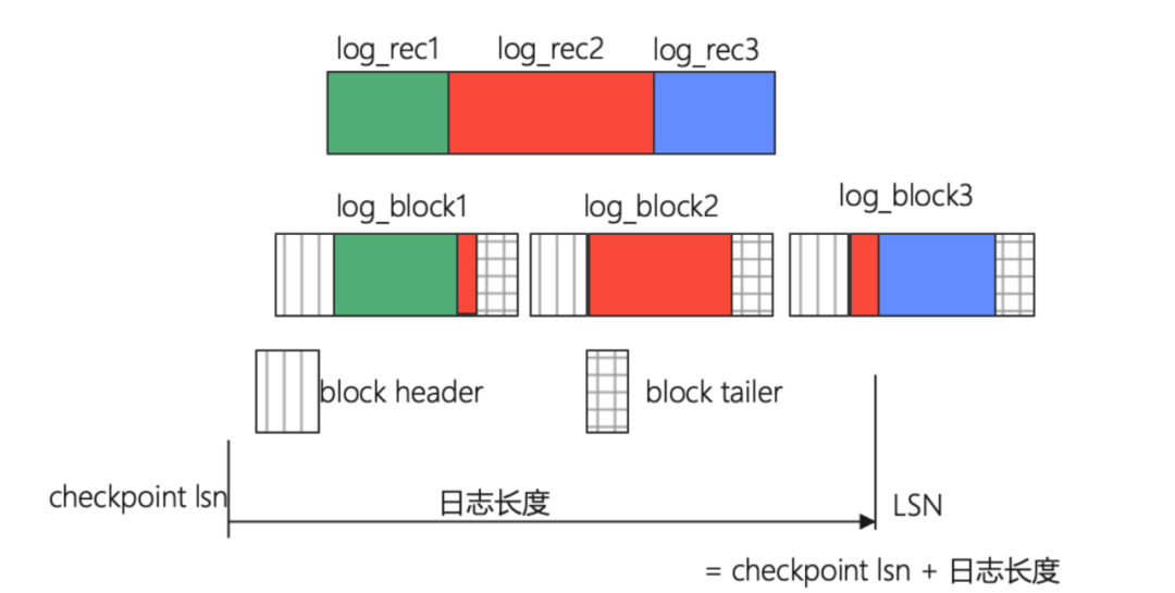 上图中,三个日志块的 LOG_BLOCK_HDR_DATA_LEN 值都为 512; log block1 的 LOG_BLOCK_FIRST_REC_GROUP 值为 12; log block2 无全新日志,则值为 0; log block3 值为 12+ 红色部分的长度; 日志块的块号依据 LSN 位置换算。