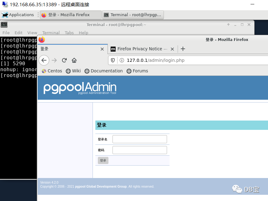 1docker rm -f lhrpgpool 2docker run -d --name lhrpgpool -h lhrpgpool \ 3 --net=pg-network --ip 172.72.6.66 \ 4 -p 19999:9999 -p 19898:9898 -p 180:80 -p 13389:3389 \ 5 -v /sys/fs/cgroup:/sys/fs/cgroup \ 6 --privileged=true lhrbest/lhrpgpool:4.2.2 \ 7 /usr/sbin/init 8 9docker network connect bridge lhrpgpool1011docker restart lhrpgpool12docker exec -it lhrpgpool bash1314-- lhrbest/lhrpgpool:4.2.2 只安装了pgpool15-- lhrbest/lhrpgpool:4.2.2_01 安装了pgpool并做了配置16-- lhrbest/lhrpgpool:4.2.2_02 安装了pgpool和pgpoolAdmin并做了配置