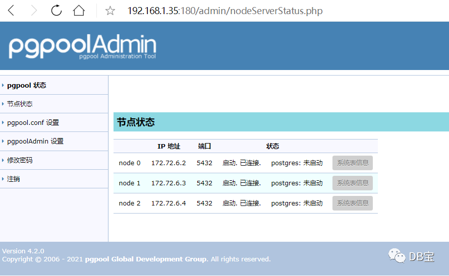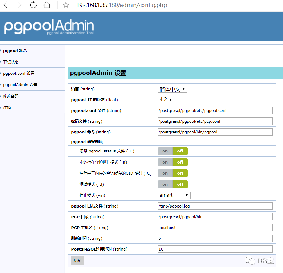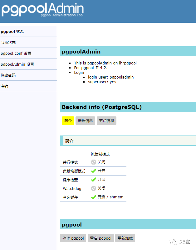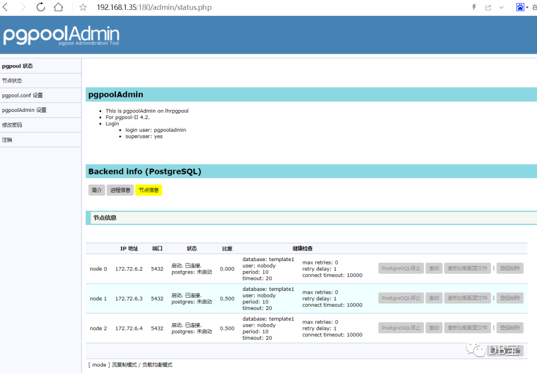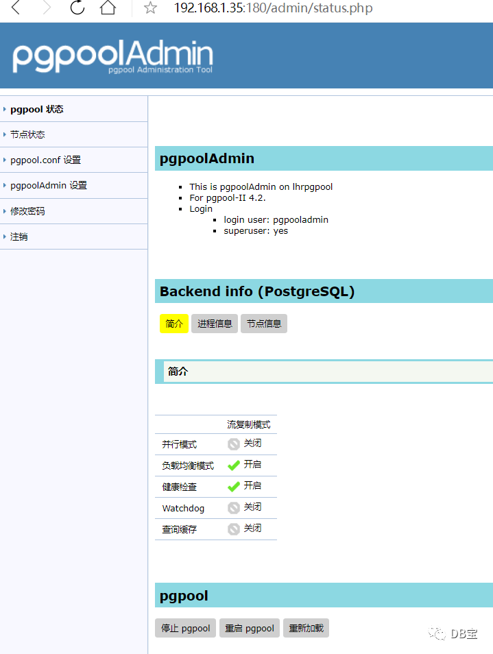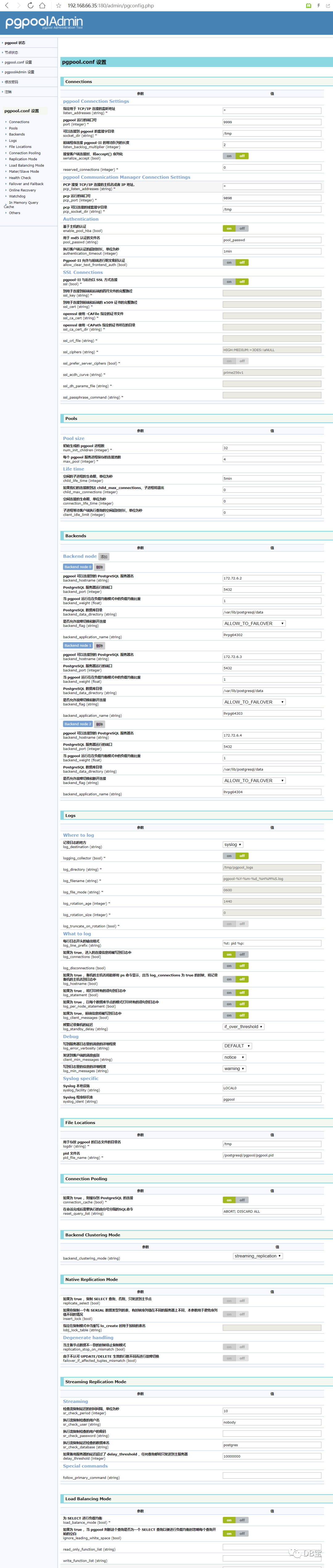 PgpoolAdmin是管理pgpool的WEB界面工具,可以对pgpool进行监控,启停服务,更改设置。