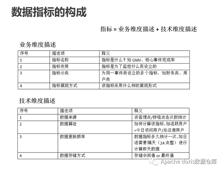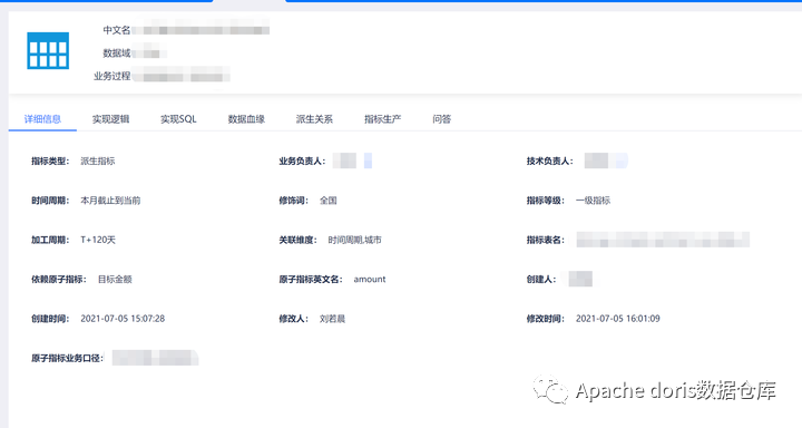 4)指标数据逻辑绑定,即除了维护指标的业务元数据外,还要建立指标的技术元数据,指标数据从哪个模型、哪个字段、何种计算逻辑得到。
