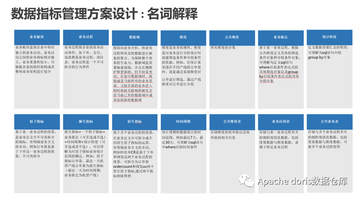 2)制定指标命名、口径说明规范,按照原子指标+业务限定+统计维度的方式,将规则集成到平台内,通过系统规则来把控指标输出。