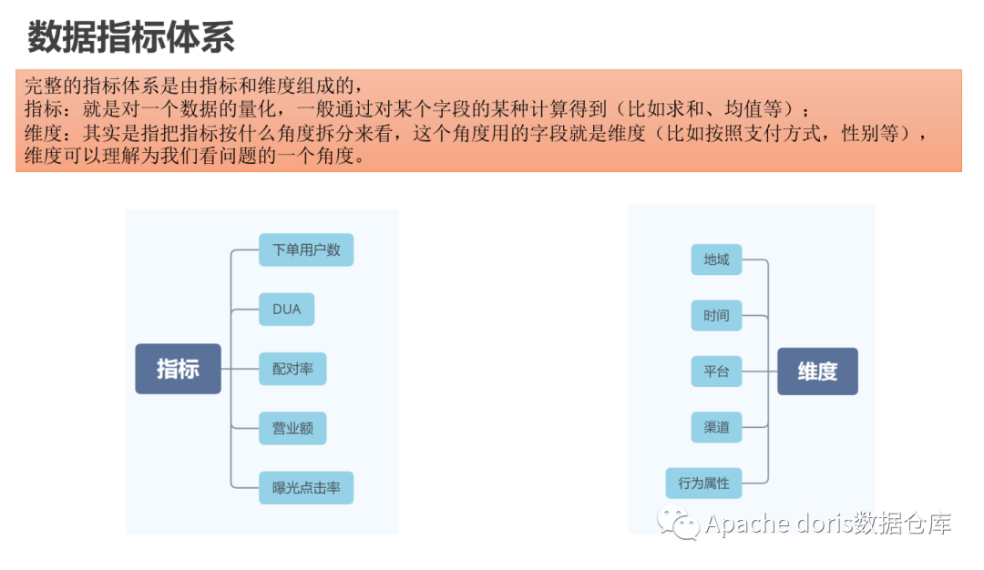 完整的指标体系是由指标和维度组成的,指标:就是对一个数据的量化,一般通过对某个字段的某种计算得到(比如求和、均值等);维度:其实是指把指标按什么角度拆分来看,这个角度用的字段就是维度(比如按照支付方式,性别等),维度可以理解为我们看问题的一个角度。
