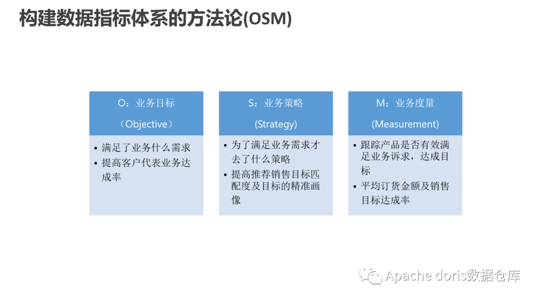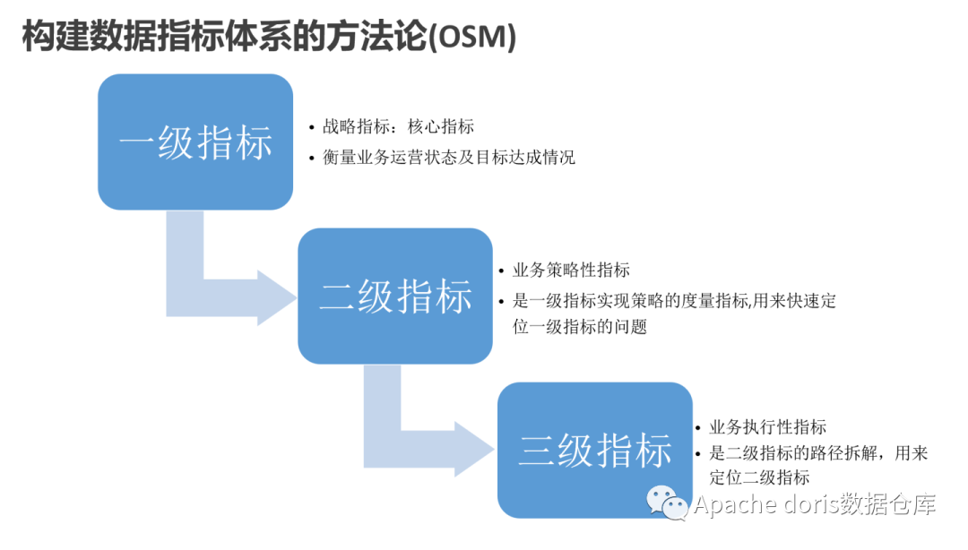 OSM 模型(Objective,Strategy,Measurement)是指标体系建设过程中辅助确定核心的重要方法,包含业务目标、业务策略、业务度量,是指标内容横向的思考。