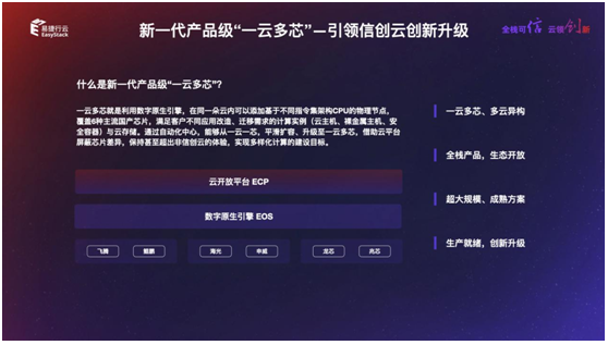 比如,金融行业在开展信创建设中,会遇到很多异构CPU架构,既有基于x86的海光,也有基于ARM的飞腾和鲲鹏。为此,易捷行云EasyStack金融全栈信创云在帮助金融机构开展信创建设过程中,采用先外围后核心策略;并通过一云多芯来解决兼容性问题,从而确保金融行业基于不同技术架构进行统一部署,实现统一管理、统一编排、统一运维,降低整体TCO成本。