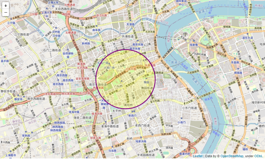 shanghai = folium.Map(location=[31.2304, 121.4737], tiles='openstreetmap',zoom_start=12)folium.Circle(location = [31.2297, 121.4762], radius = 900,color = "purple", fill = True, fill_color = "yellow").add_to(shanghai)shanghai