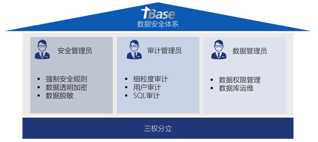 通过安全、管理、审计三权分立体系,提供全方位的数据安全保证机制;