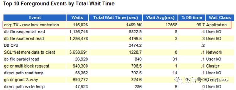 接下来我们查看了当时的AWR的报告。在AWR报告里面,我们首先要关注的是等待事件。我们看到其中TX行锁占用了大部分的等待时间,因此初步推断行锁就是导致故障的原因。
