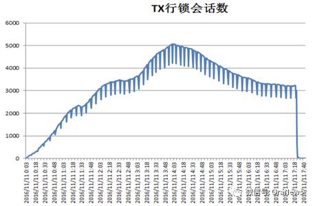 我们看到在整体的上升的趋势中,有一些点会产生向下的波动,向下的波动在行锁争用中是很常见的一种现象。当有一部分行锁被释放之后,被阻塞的量就会往下降。但是在持续的行锁阻塞中,虽然会有短暂的释放和缓解,但更多的会话会很快拥堵上来。