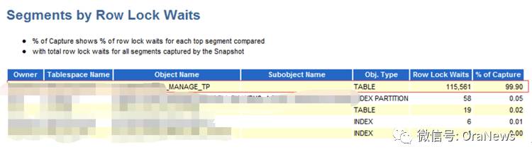 通过top SQL查行锁的话,可能会比较困难。推荐大家通过segment部分进行查询。在segment模块,有一个专门针对行锁的统计, segment by row lock waits.从这个统计中我们看到,有一张命名为_manager_tp的表,占用了99%的行锁争用。