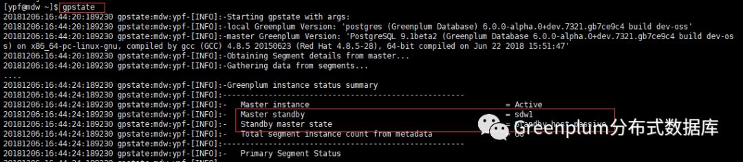 其中/home/wad/mpp-data/master/gpseg-1为standby master所在的文件目录,sdw2为要建立备份master的hostname。