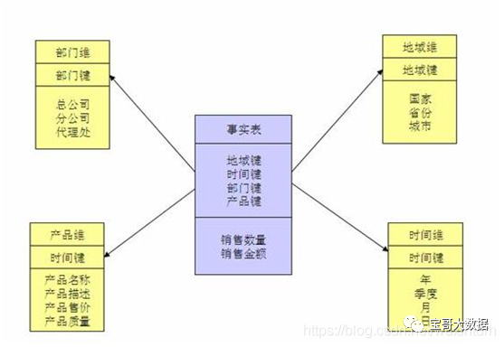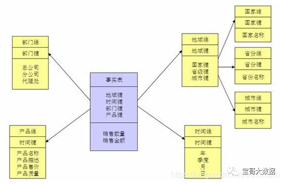 当所有维表都直接连接到 "事实表" 上时,整个图解就像星星一样,故将该模型称为星型模型,如图 1 。