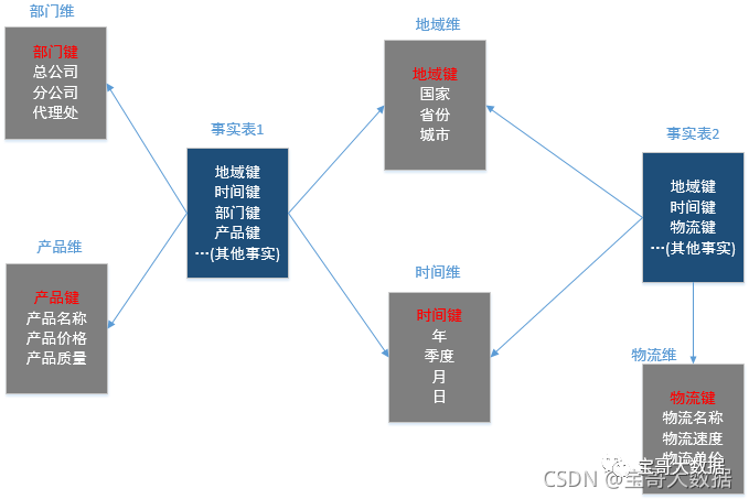 星座模型 基本上是很多数据仓库的常态,因为很多数据仓库都是多个事实表的。所以星座不星座只反映是否有多事实表,他们之间是否共享一些维度表。