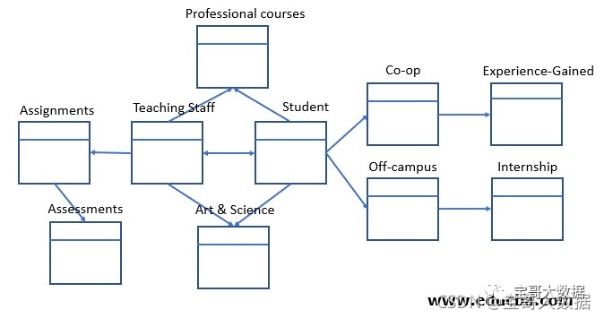 在这个例子中,学生数据库有两个事实表——学生和教职员工。两个事实表都可以有共同的维度——专业课程、艺术与科学,基于各自的部门。此外,从学生维度来看,标准化适用于获得合作社和校外工作。这可以进一步细分以提及经验类型和实习。