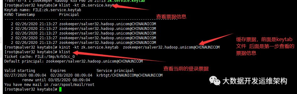 上面4)中票据“zookeeper/salver32.hadoop.unicom@CHINAUNICOM”是给salver32机器生成的,直接拷贝到32机器的/etc/security/keytabs目录下即可,可验证下票据是否可使用,分两步: