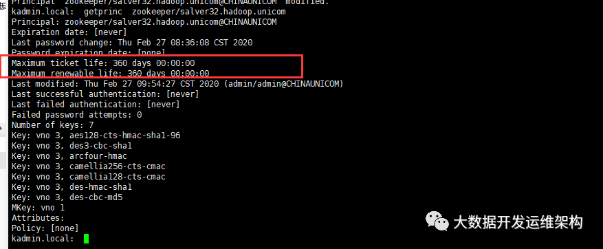 kadmin.local: getprinc zookeeper/salver32.hadoop.unicom@CHINAUNICOMPrincipal: zookeeper/salver32.hadoop.unicom@CHINAUNICOMExpiration date: [never]Last password change: Wed Feb 26 21:13:25 CST 2020Password expiration date: [none]Maximum ticket life: 3650 days 00:00:00Maximum renewable life: 3650 days 00:00:00Last modified: Wed Feb 26 21:13:25 CST 2020 (admin/admin@CHINAUNICOM)Last successful authentication: [never]Last failed authentication: [never]Failed password attempts: 0Number of keys: 7Key: vno 2, aes128-cts-hmac-sha1-96Key: vno 2, des3-cbc-sha1Key: vno 2, arcfour-hmacKey: vno 2, camellia256-cts-cmacKey: vno 2, camellia128-cts-cmacKey: vno 2, des-hmac-sha1Key: vno 2, des-cbc-md5MKey: vno 1Attributes:Policy: [none]