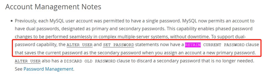 我们通俗些可以理解为双密码,retain current password这个语法只在修改密码的场景中使用,在create user中是不能用的。意思是修改密码的时候原来的密码依旧可用,这样对于业务是最友好的方式。