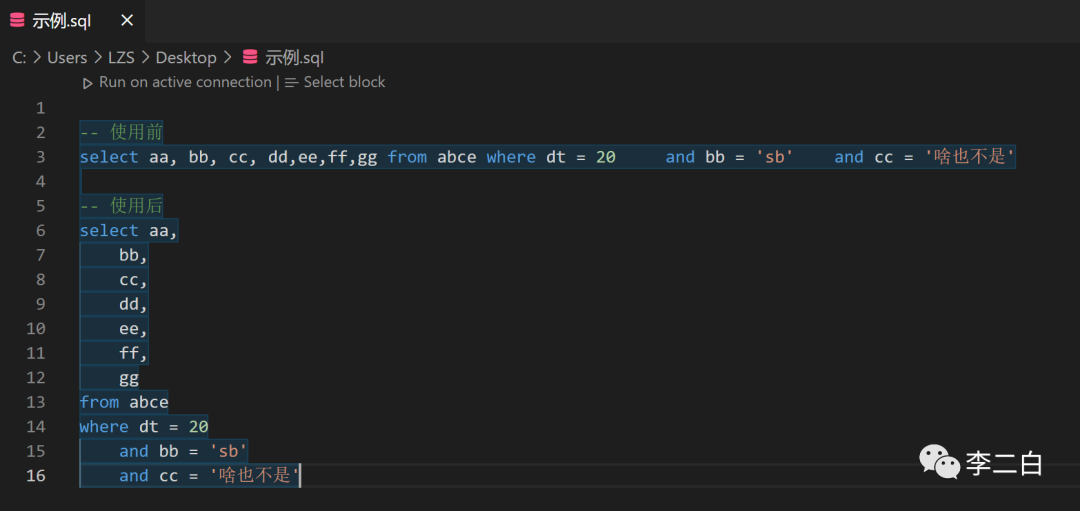 如果今天你要拆一坨sql,那么真的,用sqltools吧,不管拆几坨,他都贼好使,选中你要拆的那坨文档,点击右键 Formart Select Query For Any Ducoment