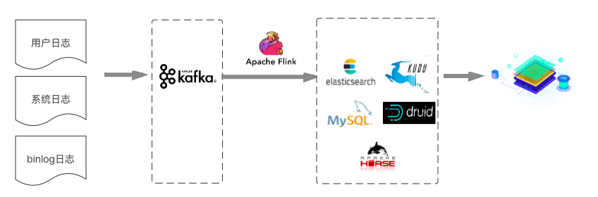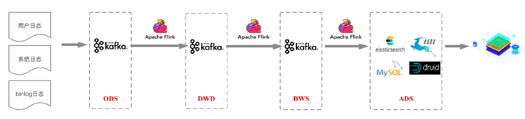 对于第一类实时数据场景来说,业界通常的做法比较简单粗暴,一般也不需要非常仔细地进行数据分层,数据直接通过Flink计算或者聚合之后将结果写入MySQL/ES/HBASE/Druid/Kudu等,直接提供应用查询或者多维分析。如下所示: