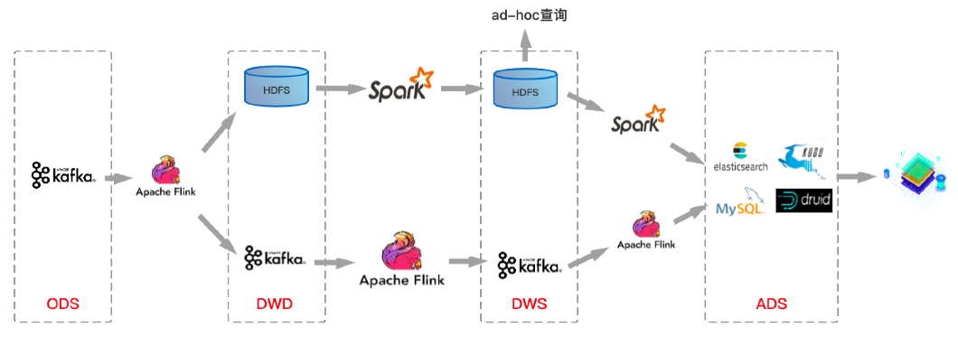 这套架构总体依然遵循标准的数仓分层结构,各种数据首先汇聚于ODS数据接入层。再接着经过这些来源明细数据的数据清洗、过滤等操作,完成多来源同类明细数据的融合,形成面向业务主题的DWD数据明细层。在此基础上进行轻度的汇总操作,形成一定程度上方便查询的DWS轻度汇总层(注:这里没有画出DIM维度层,一般选型为Redis/HBase,下文架构图中同样没有画出DIM维度层,在此说明)。最后再面向业务需求,在DWS层基础上进一步对数据进行组织进入ADS数据应用层,业务在数据应用层的基础上支持用户画像、用户报表等业务场景。