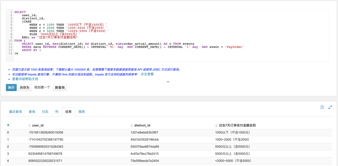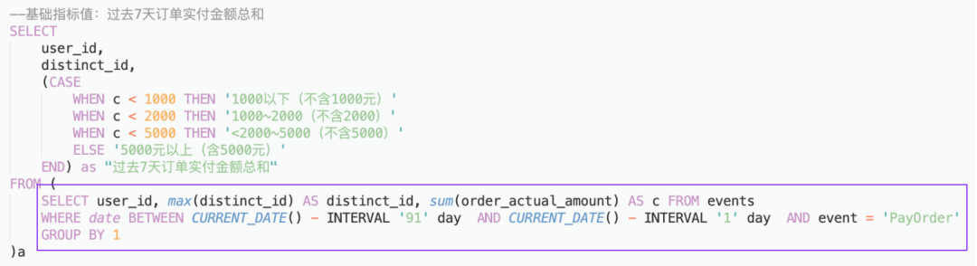 SELECTuser_id,distinct_id,(CASEWHEN c < 1000 THEN '1000以下(不含1000元)'WHEN c < 2000 THEN '1000~2000(不含2000)'WHEN c < 5000 THEN '<2000~5000(不含5000)'ELSE '5000元以上(含5000元)'END) as "过去7天订单实付金额总和"FROM (SELECT user_id, max(distinct_id) AS distinct_id, sum(order_actual_amount) AS c FROM eventsWHERE date BETWEEN CURRENT_DATE() - INTERVAL '7' day AND CURRENT_DATE() - INTERVAL '1' day AND event = 'PayOrder'GROUP BY 1)a