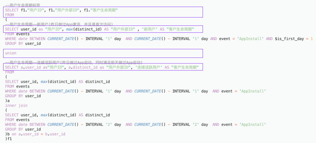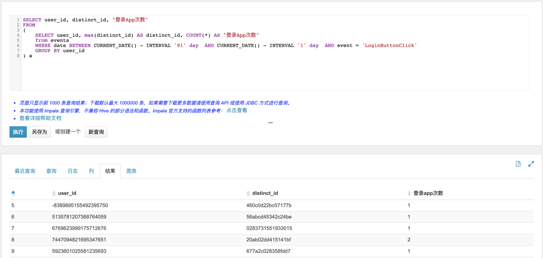 SELECT user_id, distinct_id, "登录App次数"FROM(SELECT user_id, max(distinct_id) AS distinct_id, COUNT(*) AS "登录App次数"from eventsWHERE date BETWEEN CURRENT_DATE() - INTERVAL '91' day AND CURRENT_DATE() - INTERVAL '1' day AND event = 'LoginButtonClick'GROUP BY user_id) a